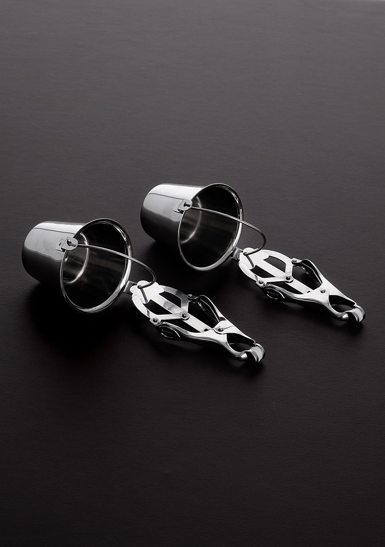 Geef je onderdanige of slaaf een unieke marteling met een set van deze tepelklemmen waarmee je op een ongewone manier gewicht kunt toevoegen! In de stijl van vlinderklemmen of klaverbladen worden deze aantrekkelijke knijpers strakker naarmate ze worden getrokken. Rubberen punten zorgen ervoor dat alle pijn in de vorm van plezier is en dat ze hun grip behouden. Om gewicht toe te voegen in de kleine, hangende emmers kunt je deze vullen met water, glijmiddel, zand, stenen of wat je sluwe geest maar kan verzinnen.
