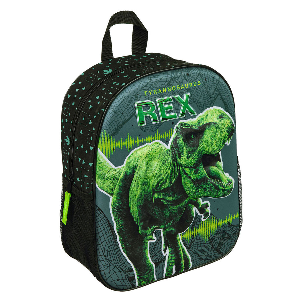 De Jurassic World groene rugzak met 3D-effect. De 3D-rugzak is uitgevoerd in de Jurassic World-kleuren en toont Tyrannosaurus Rex. De gewatteerde draagbanden zorgen voor het nodige comfort en de zijvakken van gaas bieden ruimte voor een waterfles en kleinere gebruiksvoorwerpen.
