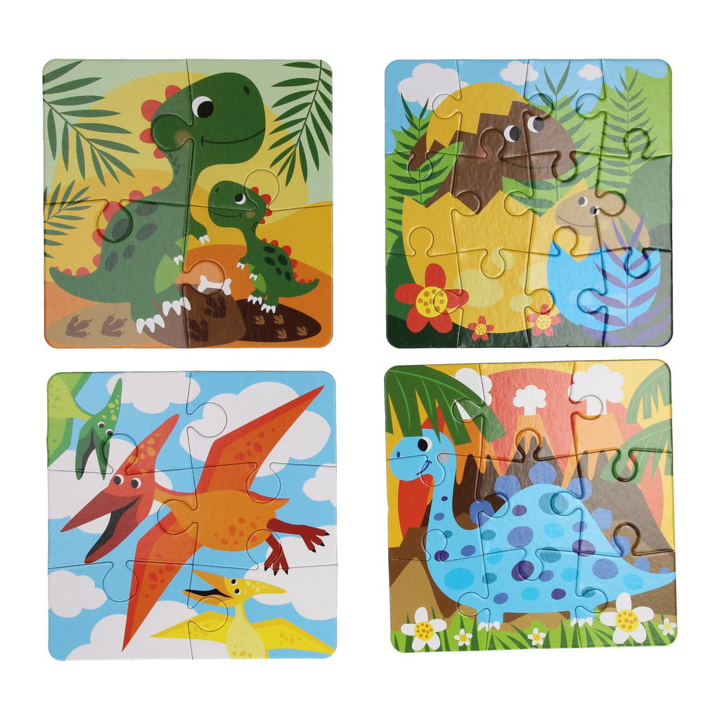 Stevige doos met 4 dinosauruspuzzels in verschillende aantallen stukjes: 4, 6, 9 en 12. Zo kun je makkelijk een uitdagendere puzzel aanbieden naarmate je kindje zijn of haar vaardigheden verder ontwikkelt. Niet geschikt voor kinderen onder de 3 jaar oud.