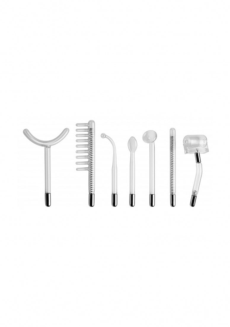 Breid je Violet Wand spel uit met 7 elektrisch erotische accessoires! Verlicht je liefdesleven met een sensueel en stimulerend lichtspel terwijl je de gloeiende hulpstukken over de gevoeligste plekken van je lichaam laat zweven en glijden. Elk van de zeven onderdelen van deze set sluit je aan op je Zeus Twilight Violet Wand, apart verkrijgbaar, om op opwindende nieuwe manieren zinderende sensatie op je gevoelige huid te sturen. De massageroller geeft een lichte en verleidelijke massage, terwijl de condensatorkam en de toverstaf intensere stimulatie bieden. De gebogen Y omlijnt gebogen gebieden zoals borsten, billen, benen, of keel. Ook inbegrepen zijn de traditionele baltip sonde, tong, en paddestoel opzetstukken voor gericht genot. Ervaar de subtiele schok van elektrosex die deze accessoires te bieden hebben!