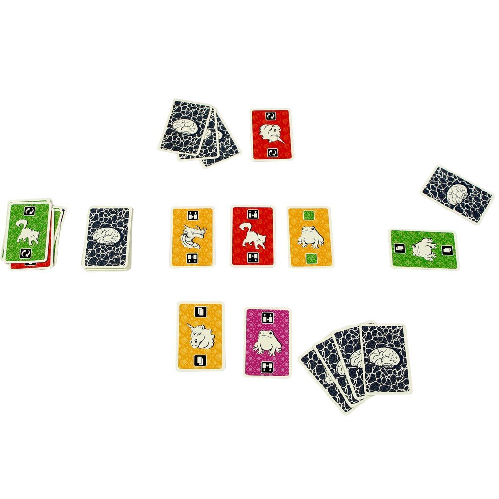 The Brain bestaat uit 1 of meer pogingen om eenpuzzel op te lossen,totdat de spelers het hebben gehaald of opgeven. Er wordt met de klok mee gespeeld. Ben je aan de beurt, dan moet jeeen kaartin het midden leggen én de bijbehorendeactie uitvoeren.Daarna mag je een kaart van de trekstapel pakken. Julliewinnenhet spel als alle handkaarten zijnweggespeelden de trekstapel leeg is. Maar zodra er aan het einde van een beurt een vooraf bepaaldaantal kaarten in het midden ligt,hebben jullie allemaalverloren.Daarna kun jeoverleggenhoe je het bij een volgende poging wel voor elkaar kunt krijgen. Door deverschillende uitgangssituatiesen de velemoeilijkheidsgradatiesblijft dit kaartspel van eigen makelij steedsuitdagen! Ook solitair te spelen!