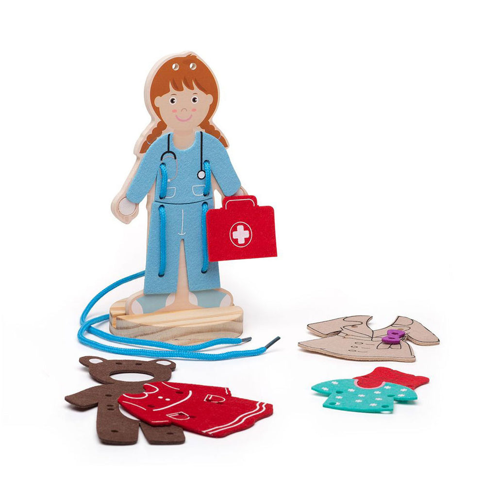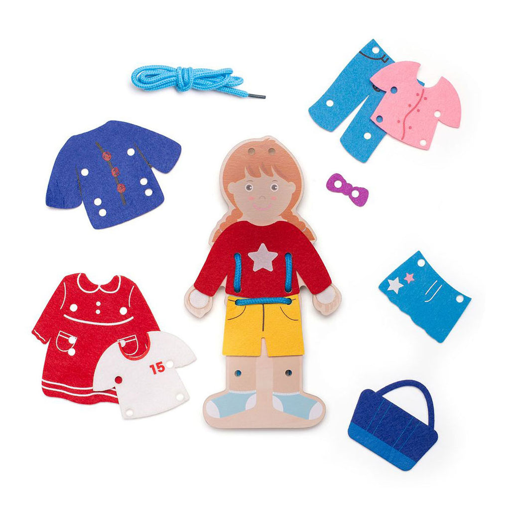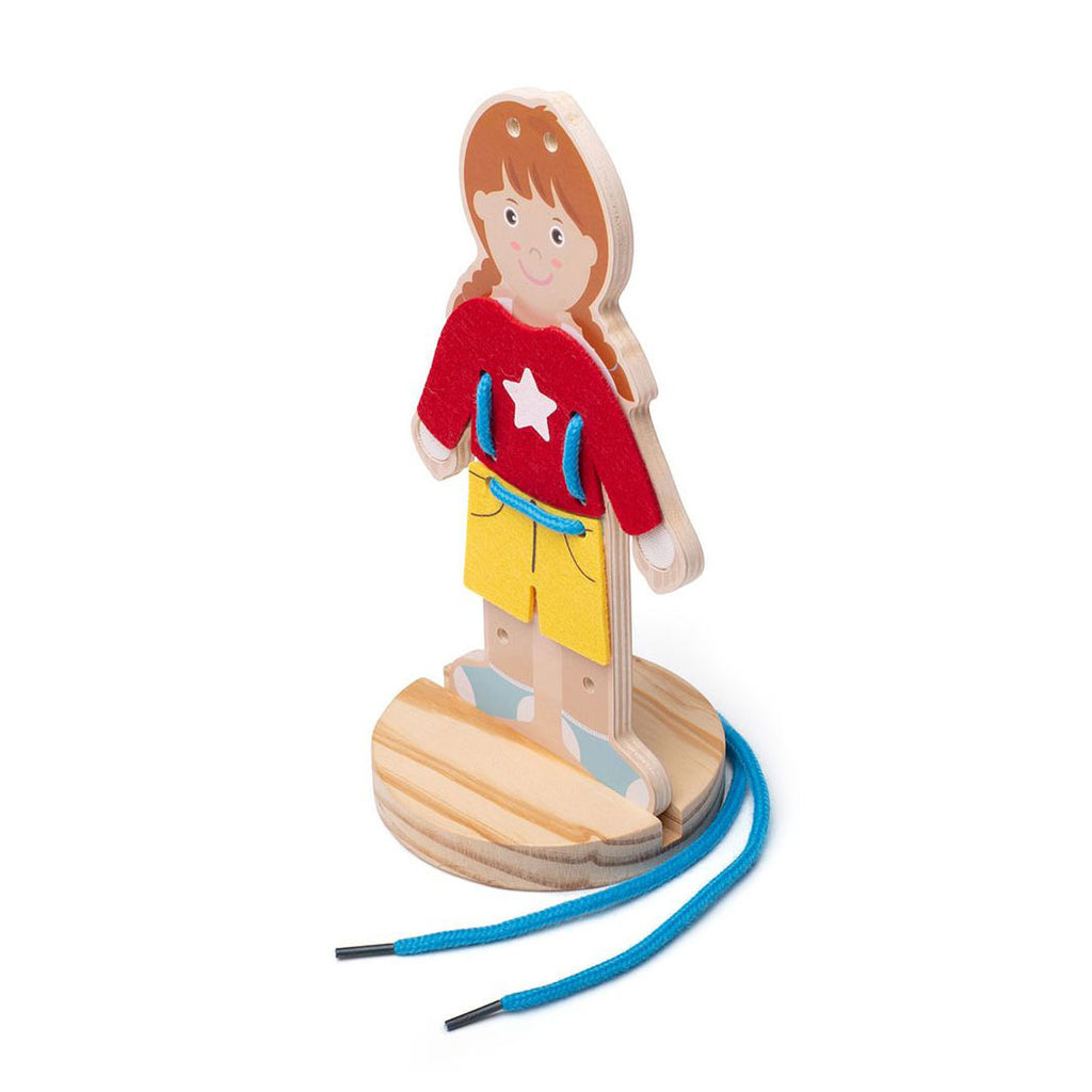 Wat zullen we vandaag dragen? Dit houten personage staat klaar en wacht op jou om haar aan te kleden. Een leuk houten rijgspeelgoed: mix en match de outfits door ze op het houten bord te rijgen met het meegeleverde touwtje. Dit rijgspeelgoed voor peuters heeft voorgeperforeerde gaten die de perfecte maat hebben om het touwtje door te rijgen. Een geweldige manier om behendigheid en hand-oogcoördinatie te ontwikkelen. Gemaakt van hoogwaardige, verantwoorde materialen.