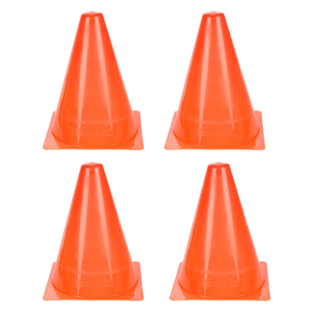 Set van 4 oranje pionnen voor training, sport of spellen. Gemaakt van stevig kunststof. Afmetingen: 14,5 x 14,5 x 19 centimeter groot.