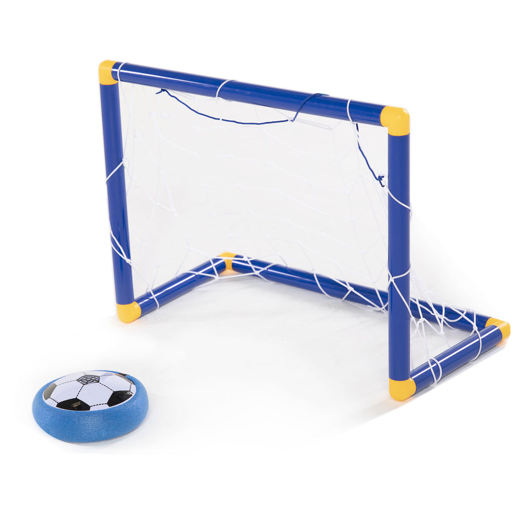 Een potje voetballen, maar dan binnen! Het kan met de Airvoetbalset met Doeltje. De airvoetbal is plat en de onderkant is voorzien van een dikke laag foam zodat hij gemakkelijk over een vloer glijdt. Zowel op tapijt, hout, laminaat en keramiek doet deze voetbal het goed. De Air Voetbal geeft gekleurd licht als je er tegenaan knalt. Het blauw-gele doeltje is gemaakt van stevig kunststof en heeft een wit net. Werkt op 3 AA batterijen (niet inbegrepen).