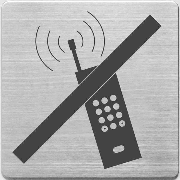 Pictogrammen, zelfklevend, vervaardigd van hoogwaardig mat geborsteld rvs met zwarte opdruk, vierkant model met afgeronde hoeken, opdruk: Mobiel niet toegestaan, afmeting 90x90x1mm.