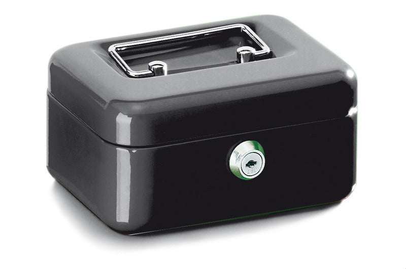 Metalen geldkist, binnen en buitenkant krasvrij gelakt. Met twee sleutels en uitneembare kunststof vakverdeling. Het deksel is voorzien van een verzonken handgreep. 152x118x76mm. Kleur zwart.