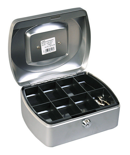 Geldkist, staal, fraai modern design, voorzien van 8-vaks kunststof binnenbak, afsluitbaar met cylinderslot incl. 2 sleutels. Afmeting 205x160x85 mm. Kleur zilver.