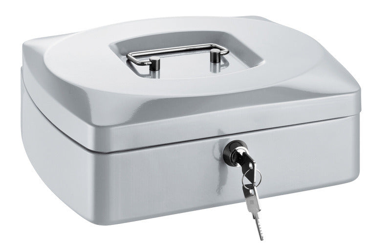Geldkist, staal, fraai modern design, voorzien van 8-vaks kunststof binnenbak, afsluitbaar met cylinderslot incl. 2 sleutels. Afmeting 225x200x90mm. Kleur zilver.