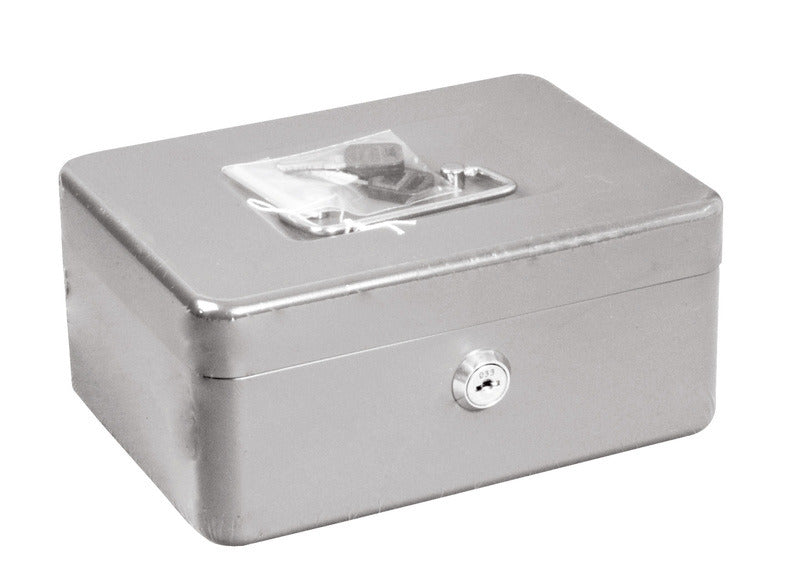 Metalen geldkist, binnen en buitenkant krasvrij gelakt. Met twee sleutels en uitneembare kunststof vakverdeling. Het deksel is voorzien van een verzonken handgreep. Staal zilverkleurig. 200x150x95mm.