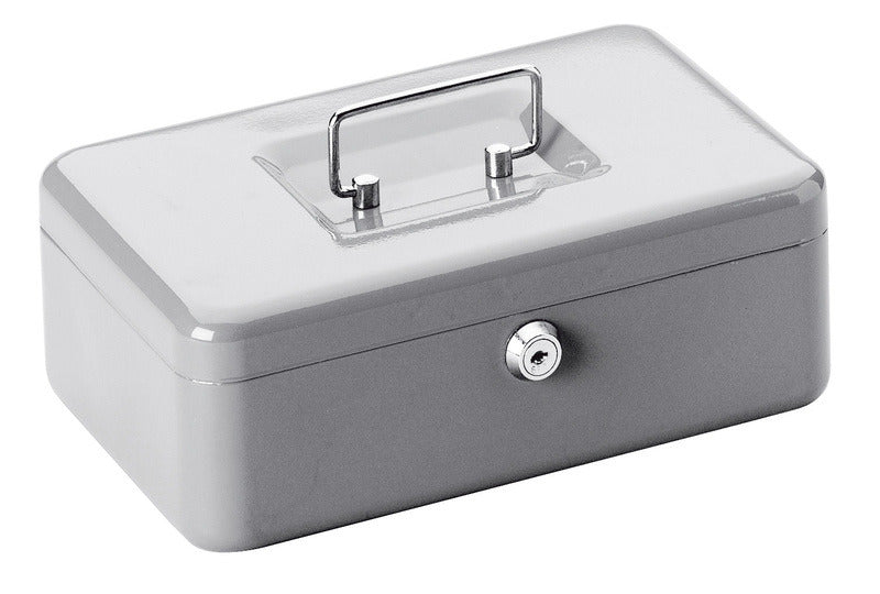Metalen geldkist, binnen en buitenkant krasvrij gelakt. Met twee sleutels en uitneembare kunststof vakverdeling. Het deksel is voorzien van een verzonken handgreep. 250x170x90mm.
