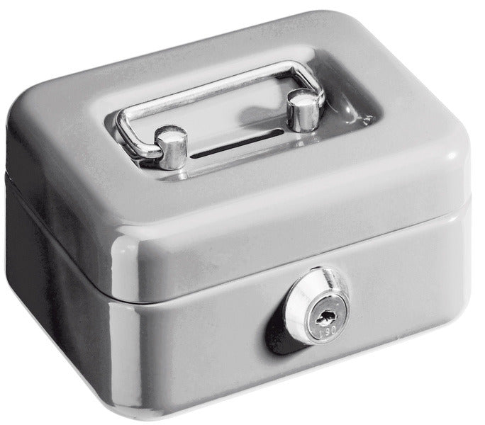 Metalen geldkist, binnen en buitenkant krasvrij gelakt. Met twee sleutels en gleuf. Deksel met verzonken handgreep. Kleur zilver 125x95x60mm.