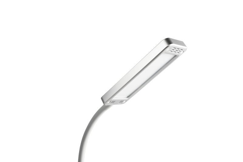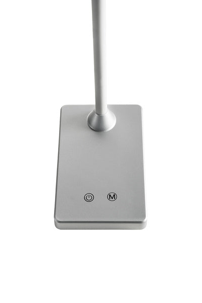 Elegant en compacte LED bureaulamp in een simpele moderne look. De lamp en de voet hebben dezelfde vorm. Het bovenste deel van de lichtarm is flexibel, en in alle richtingen verstelbaar. De lamp is in 3 stappen dimbaar en ook in 3 verschillende lichtkleuren configureerbaar. (warme en koude verlichting). 230V/ 16+8LEDs / 6W. Lichtstroom: 360 lumen. Lichtsterkte: op 30cm 1200 lux. Levensduur van de LED's ca. 30.000 uur. Kleurtemperaturen: 3000-4000-6000k Kleur lamp: Zilver.