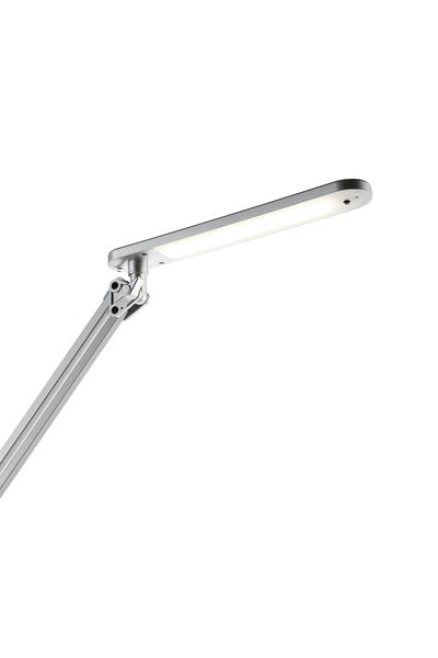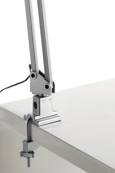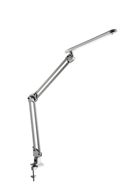 Led bureaulamp met functionele dubbele arm voor individuele aanpassing op de werkplek. De reflector is horizontaal en verticaal verstelbaar. De lamp heeft een klem voor bevestiging aan tafel. 230V/ 20LEDs / 7W. Lichtstroom: 420 lumen. Lichtsterkte: op 40cm 1250 lux. Levensduur van de LED's ca. 30.000 uur. Kleurtemperatuur: 5000k. Afmeting lamp: 50x28x28,5cm. Kleur lamp: Zilver.