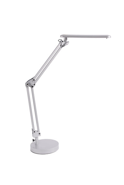 Led bureaulamp met functionele dubbele arm voor individuele aanpassing op de werkplek. De reflector is horizontaal en verticaal verstelbaar. 230V/ 20LEDs / 7W. Lichtstroom: 420 lumen. Lichtsterkte: op 40cm 1250 lux. Levensduur van de LED's ca. 30.000 uur. Kleurtemperatuur: 5000k. Afmeting lamp: 44x28x28,5cm. Kleur lamp: Zilver.