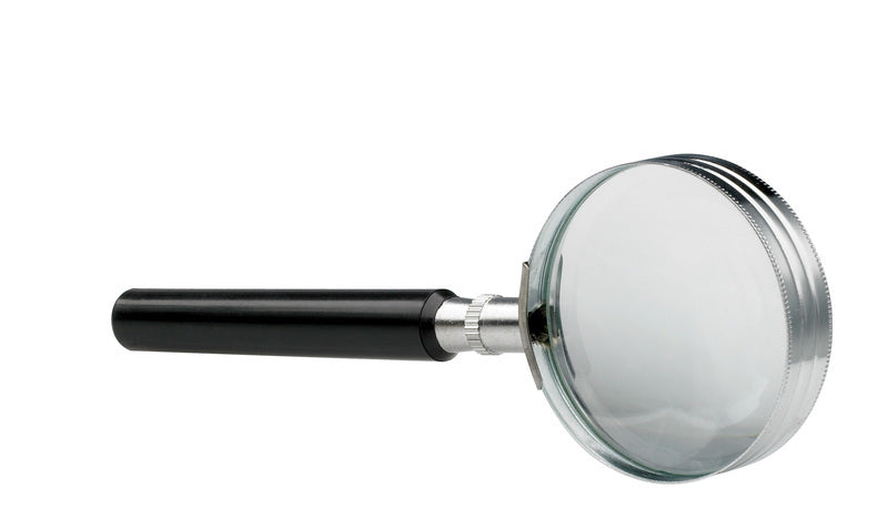 Handloep met glazen lens 50 mm, vergroot 5x, met zwarte handgreep. Aantal: 12 stuks.