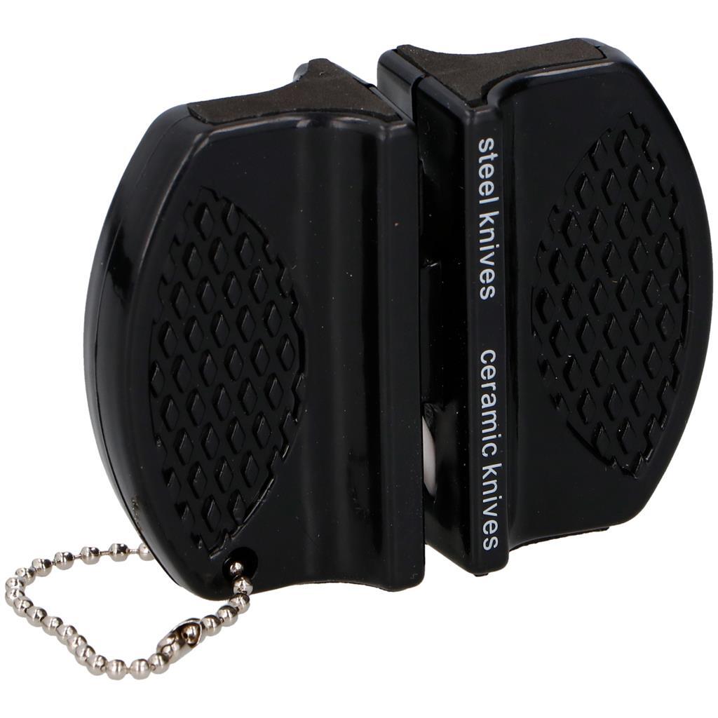 Een draagbare messenslijper gemaakt van roestvrij staal en keramiek met twee gekruiste hardmetalen messen met vooraf ingestelde hoeken om elke keer de perfecte rand te garanderen. De tweede stap maakt gebruik van gekruiste keramische staven om een ??vlijmscherpe rand te creëren. Kan gebruikt worden voor messen, scharen, gereedschappen en meer kleine voorwerpen.Materiaal keramiek, staal, kunststof.Afmeting 7 x 6 cm.