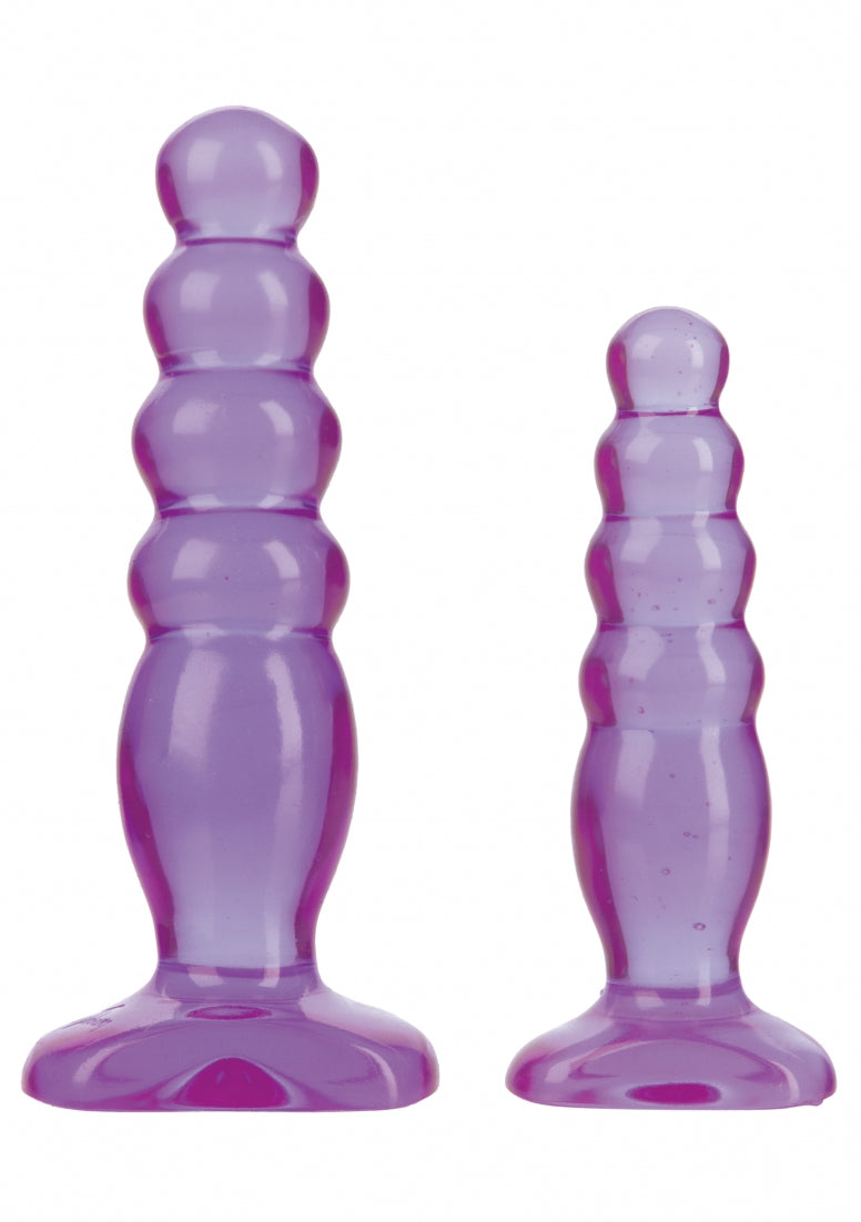 Verken je achterdeur met vertrouwen! Met een en middelgrote plug is de Crystal Jellies Anal Trainer Kit de perfecte pasvorm voor beginners in anaal spel. De kleine plug kenmerkt zich door een inbrengbare lengte van 4?, en de grote plug door een inbrengbare lengte van 6? Deze pluggen hebben een breed uitlopende basis voor veilig en comfortabel anaal spel. Crystal Jellies zijn gemaakt van ftalaatvrij lichaamsveilig materiaal. Trots gemaakt in Amerika.
