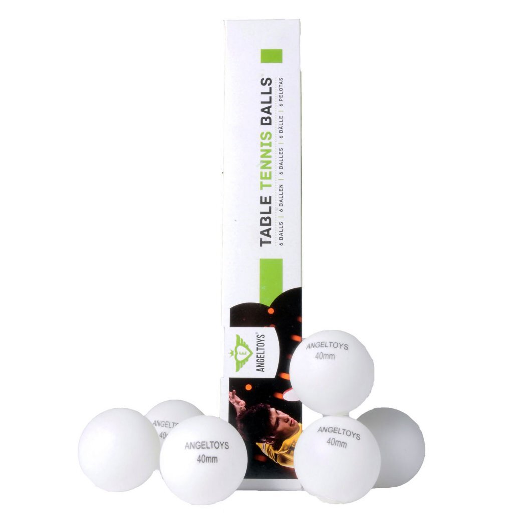 Tafeltennisballen per 6 stuks verpakt in een doosje. Materiaal plastic, kleur wit, diameter 40mm.