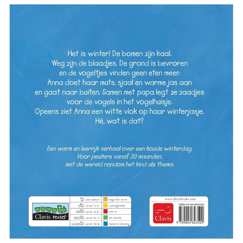 De bomen zijn kaal. Weg zijn de blaadjes. De grond is bevroren en de vogeltjes vinden geen eten. Winter! Anna doet haar muts, sjaal en jas aan en stapt naar buiten.