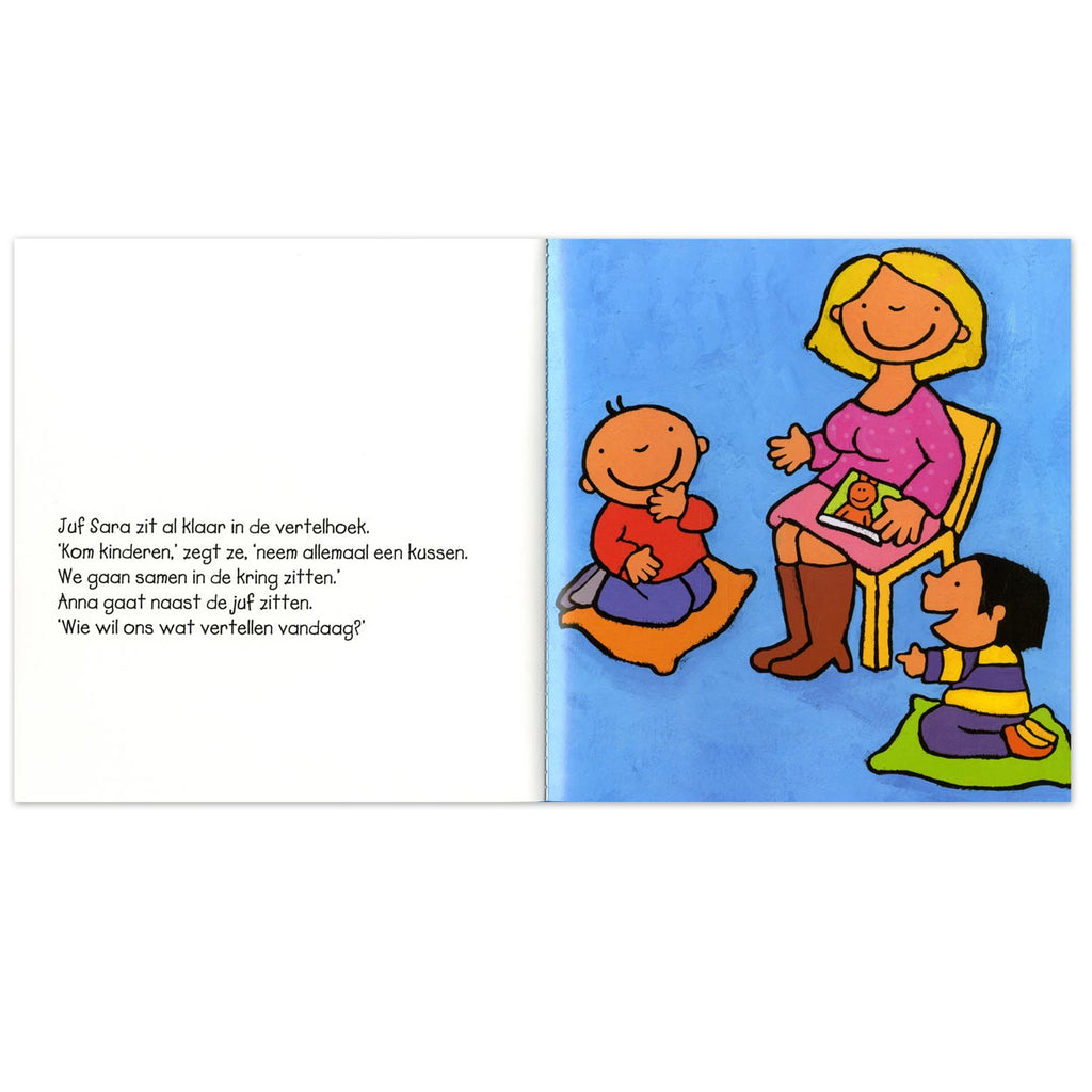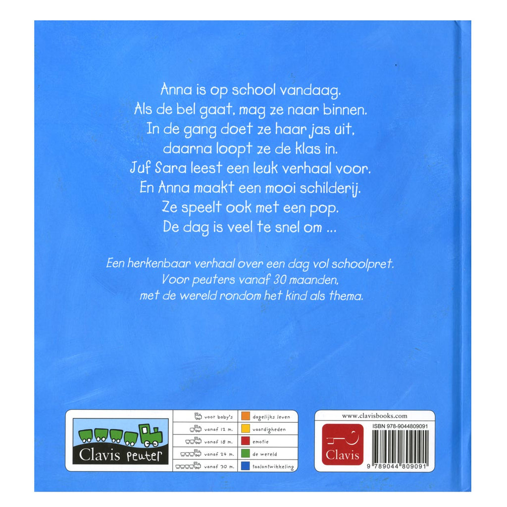 Anna is op school vandaag. Als de bel gaat, mag ze naar binnen. In de gang doet ze haar jas uit, daarna loopt ze de klas in. Juf Sara leest een leuk verhaal voor. En Anna maakt een mooi schilderij. Ze speelt ook met een pop. De dag is veel te snel om