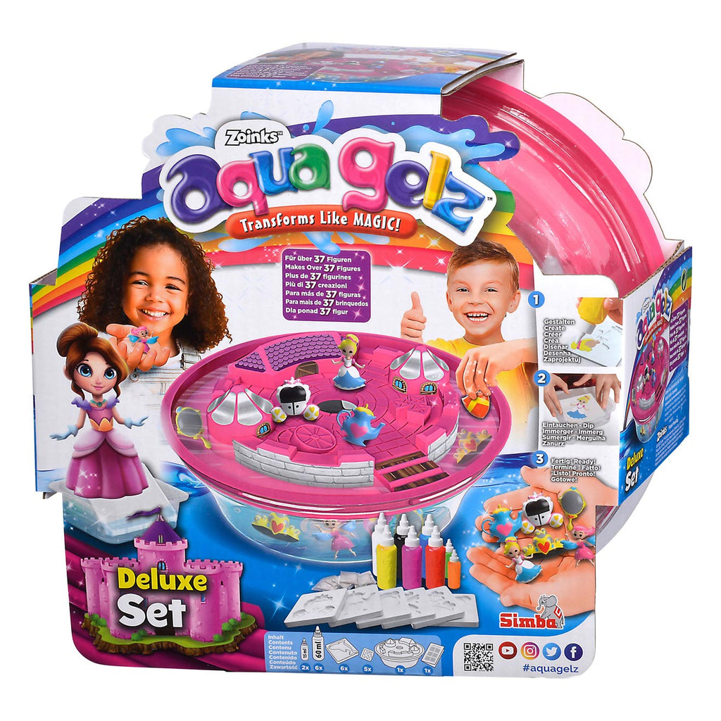 Aqua gel startersset met 6 mallen in onderwaterwereld- en prinsessenthema, 8 kleuren gel en 6 zakjes om toe te voegen aan het water waarin je de figuren dompelt. Daarnaast wordt er een waterbak meegeleverd met een speelkasteel erbovenop.