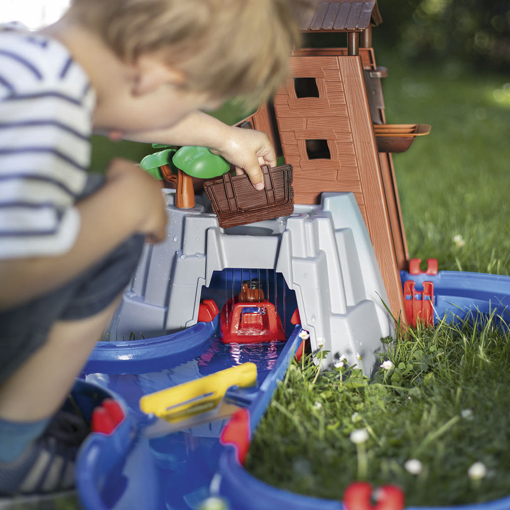 Wat een fantastische waterbaan is dit Adventure Land van AquaPlay! Beer en Krokodil beleven de gekste dingen in deze wildwaterbaan! Veroorzaak stroming met de hendels, laat ze van de glijbaan af gaan, vaar onder de waterval door en blokkeer de baan zodat ze weer de andere kant op moeten! Urenlang speelplezier met deze mooie waterset. Inhoud: 69 delen om de baan in elkaar te zetten, 2 speelfiguren en 2 bootjes. Gemaakt van kunststof, afmetingen van de baan: 138 bij 88 bij 47 centimeter.