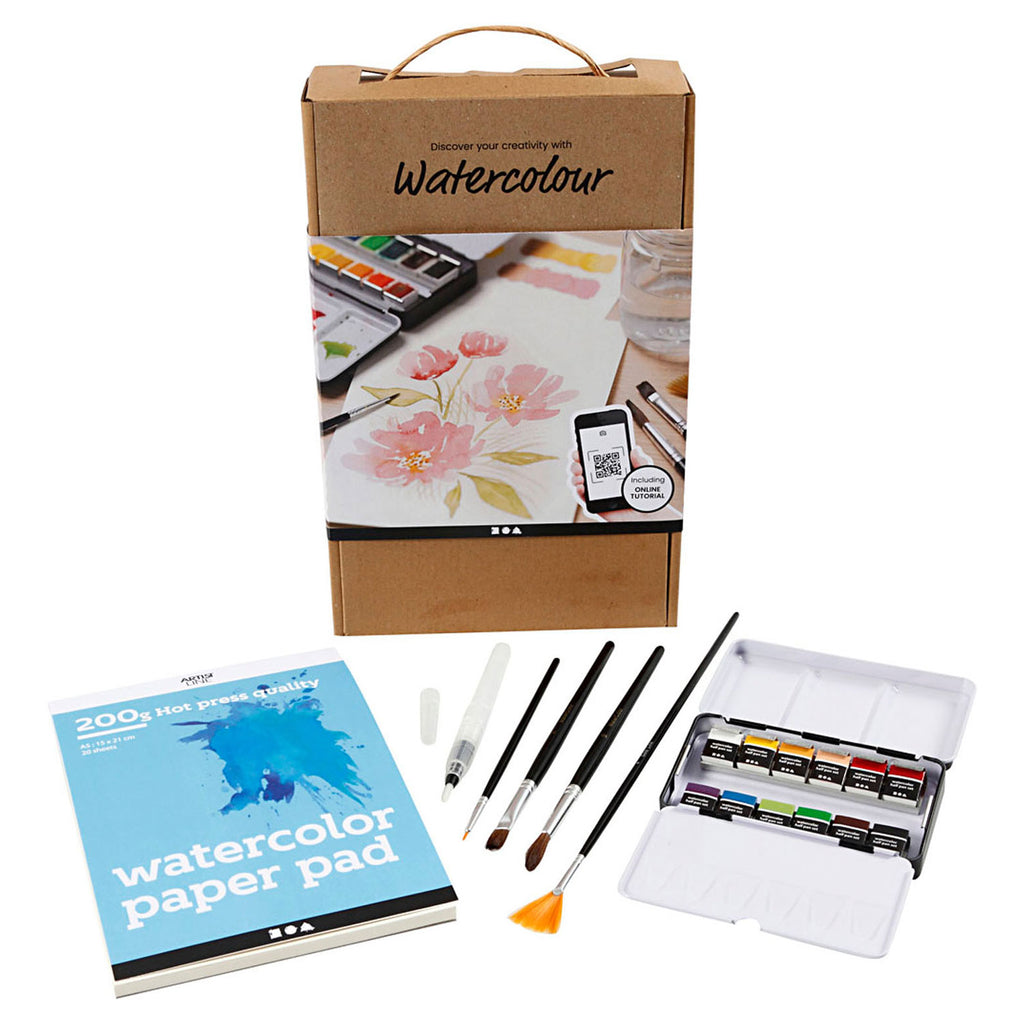 Leer schilderen met aquarelverf met deze trainingskit, die alles bevat wat u nodig heeft om aan de slag te gaan. Scan de QR-code en laat u veilig door de training leiden, waar u verschillende aquareltechnieken kunt leren. Bovendien heeft u aan het einde een prachtige aquarel