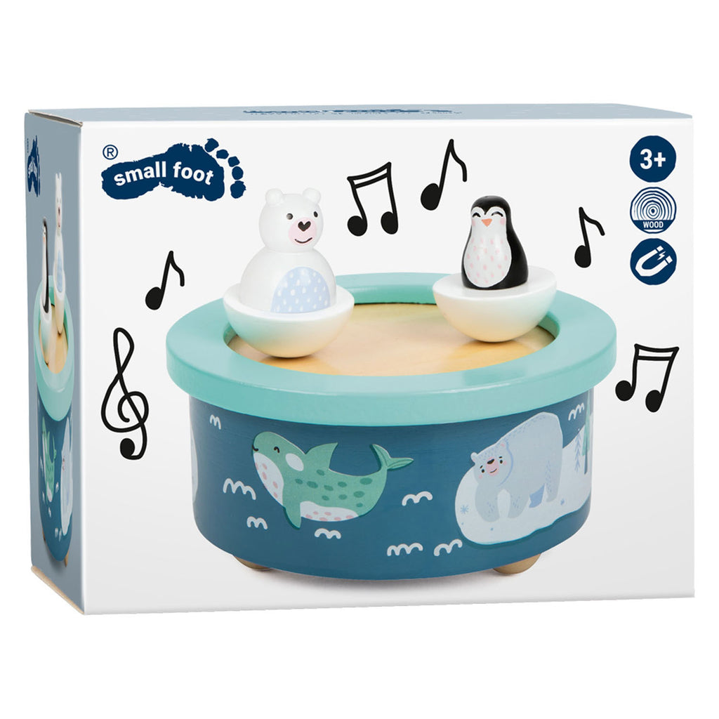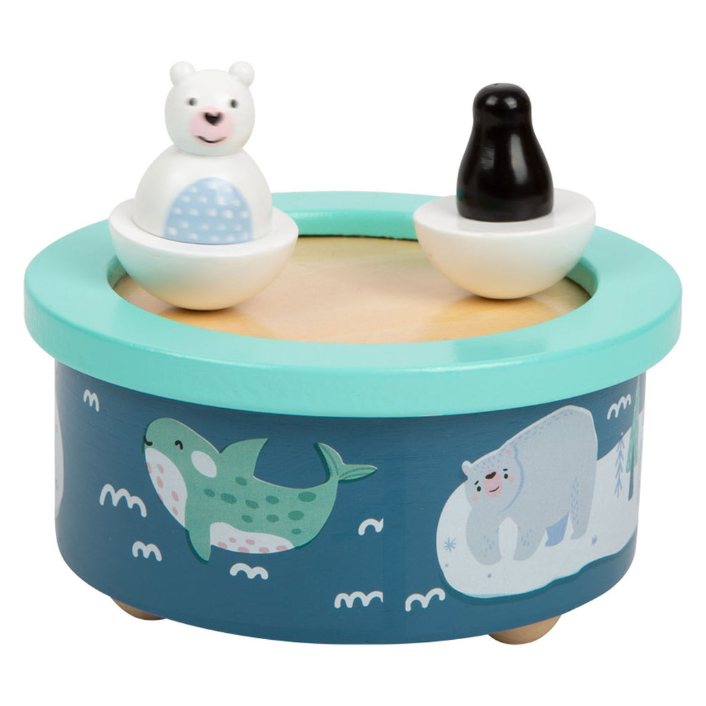 Wanneer de pinguïn en de ijsbeer beginnen te dansen, zijn zoete dromen gegarandeerd! Deze houten speeldoos in arctisch design speelt de zachte melodie "Twinkle, Twinkle Little Star" terwijl de ijsbeer en de pinguïn rondcirkelen op hun ijsblokken. Beide houten beeldjes zijn uit de doos te halen en door de eenvoudige bediening kunnen kinderen de muziekdoos zelf bedienen.