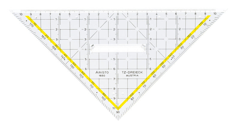 Multifunctionele tekendriehoek. Te gebruiken als liniaal, driehoek en parallelliniaal. Met horizontale en verticale schaalverdeling. Met vaste greep. Met een facetgeslepen zijde aan de lange kant en inktnoppen aan de onderzijde. Voldoet aan de ÖNORM A2134. Lengte 22.5 cm. Materiaal: aristopal. Transparant.