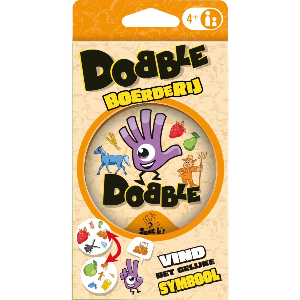 Asmodee Dobble Boerderij, vind het gelijke symbool. Geschikt voor kinderen vanaf 4 jaar.