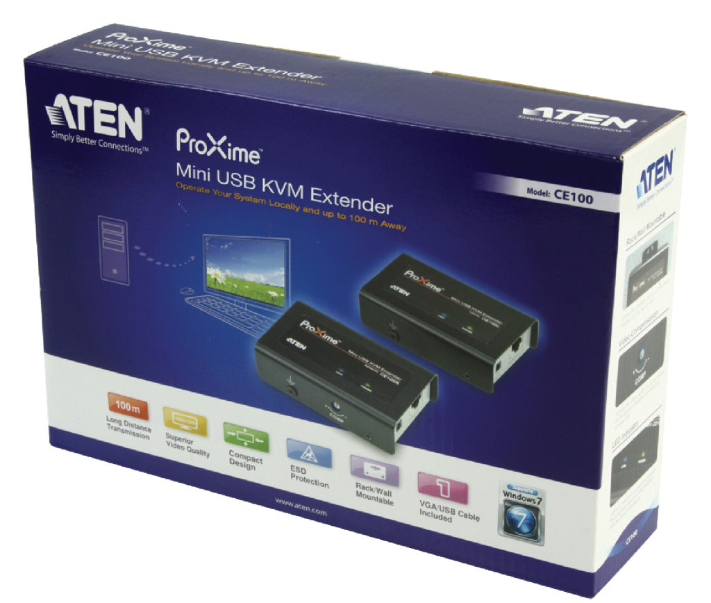De CE100 KVM Extender met superieure videokwaliteit en de ingebouwde ESD-bescherming biedt toegang tot een computer vanaf een externe USB console (een USB-toetsenbord, een USB muis en monitor)De CE100 is t. o. v. eerdere versies op deze punten verbeterd: 1) integratie van een aanpassingsfunctie bij de Remote unit voor een grotere video-kwaliteit 2) gebruik van minder dure Cat 5e kabel, in plaats van omvangrijke, dure, standaard kabels, voor een netterre, handiger en meer betrouwbaarder verbinding voor gegevensoverdracht.