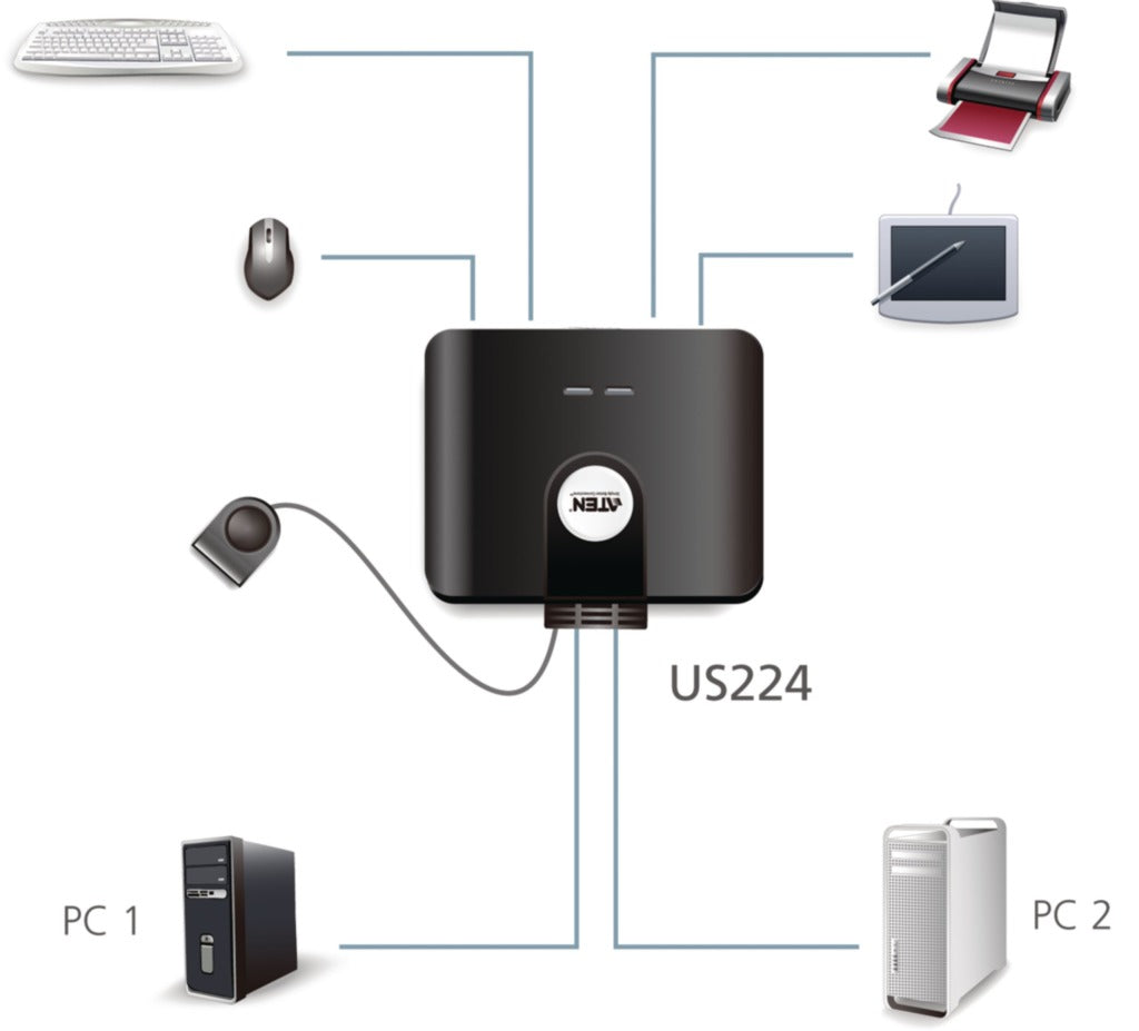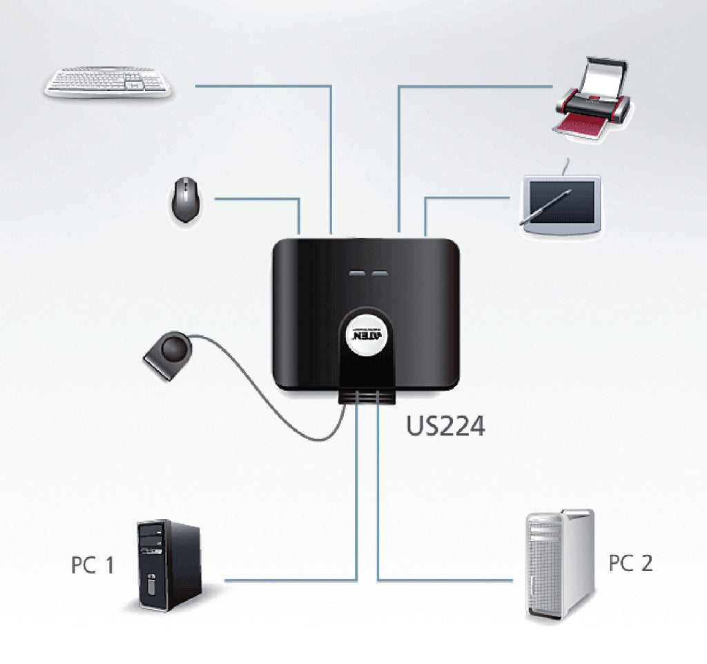 De US224 is een USB-apparaat met twee poorten waarmee randapparatuur gedeeld kan worden. 2 computers kunnen 4 USB-apparaten delen een toetsenbord, muis en tot aan twee stuks randapparatuur. Dit bespaart de extra kosten die gemaakt worden wanneer voor elke computer een afzonderlijk USB-toetsenbord, muis en andere randapparatuur wordt aangeschaft. Het alles-in-een ontwerp van de US224 maakt een nette en opgeruimde installatie mogelijk het is niet langer nodig om 2 afzonderlijke USB-kabels op de computer aan te sluiten, wat de warboel van kabels reduceert.