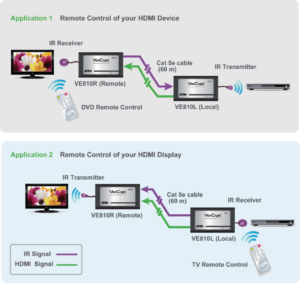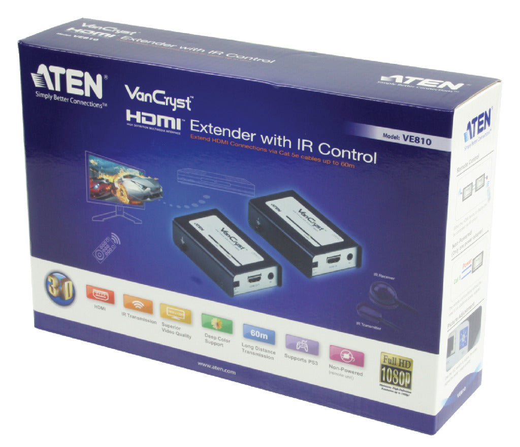Met de VE810 HDMI-extender kunt u uw HDMI-beeldscherm tot op 60 m van uw HDMI-bronapparaat plaatsen met behulp van twee Cat 5e-kabels. Daarnaast stuurt de VE810 infraroodsignalen door waarmee u, via het infraroodkanaal, het HDMI-bronapparaat kunt bedienen vanaf de ontvang- naar de zendmodule, of het weergaveapparaat kunt bedienen vanaf de zend- naar de ontvangmodule.Voor meer flexibiliteit en gemak hebt u bij de installatie van de VE810 slechts één netvoedingsadapter voor beide modules nodig. De ontvangmodule van de VE810R werkt zonder extra voedingsadapter, omdat deze wordt gevoed via de zendmodule.