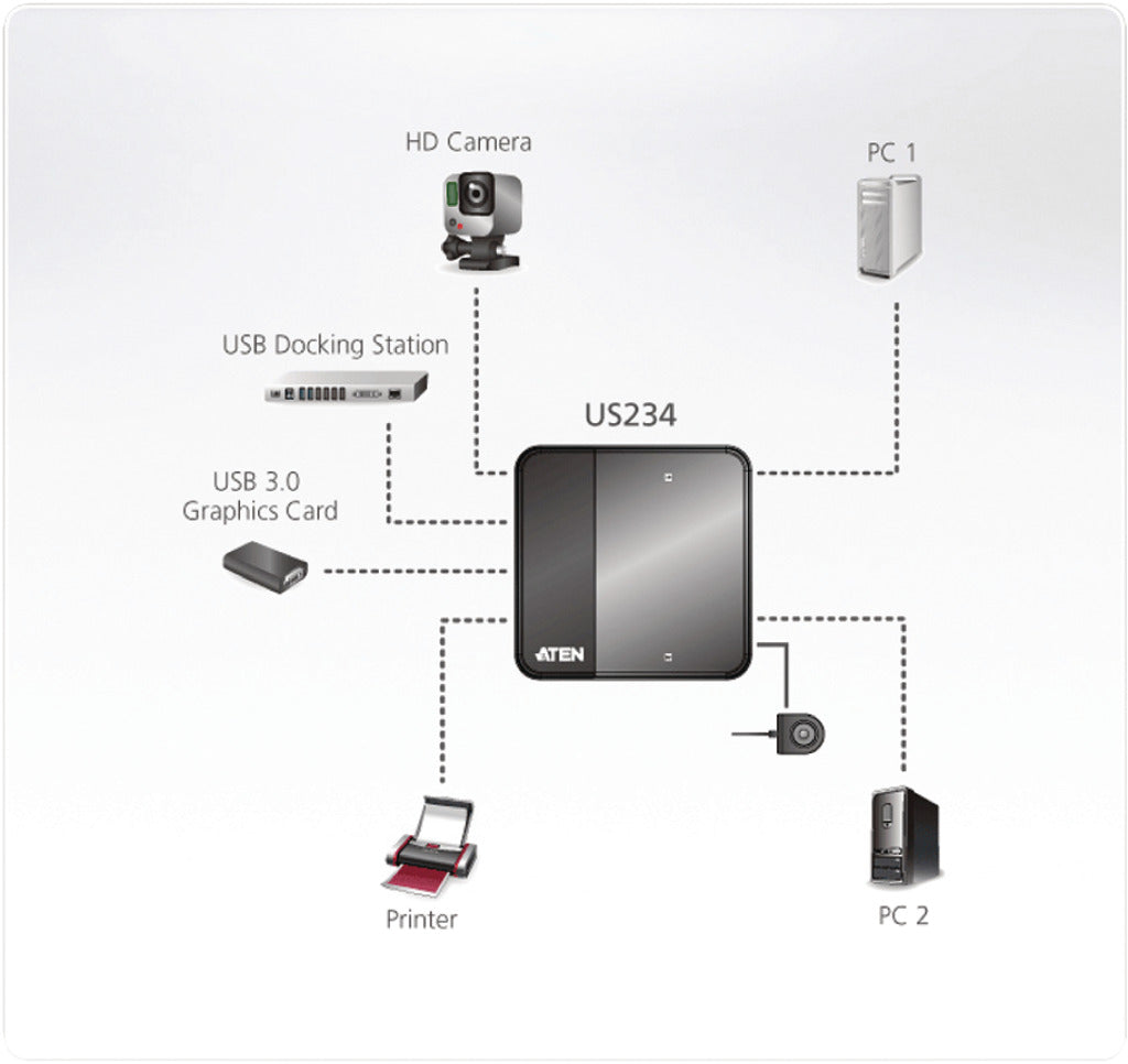 ATEN US234 is a 2-port USB 3.0 peripheral sharing device that allows users to share four USB devices between 2 different computers. US234 is USB 3.0 compliant, which can support data transfer rate up to 5Gbps and backwards compatible with USB 2.0 and USB1.1. It is perfect for high-bandwidth devices, such as USB docking stations or HD cameras.