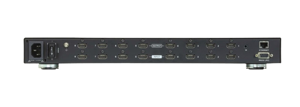 The VM0808HA matrix switch offers an easy and affordable way to route any of 8 HDMI video sources to any of 8 HDMI displays and can be operated through front-panel pushbuttons, IR remote, RS-232 control and Ethernet connections, ensuring optimum viewing and control of high-definition video. Moreover, with a built-in Web GUI, the VM0808HA is easily accessible via any web browser for remote configuration and customization of each HDMI source and display connection.