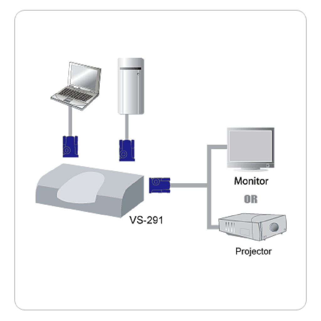 The VS291 is a video switch with 2 ports. It allows 2 independent computers to display their video outputs on a single monitor. Therefore, users will not need to buy monitors for each computer additionally.