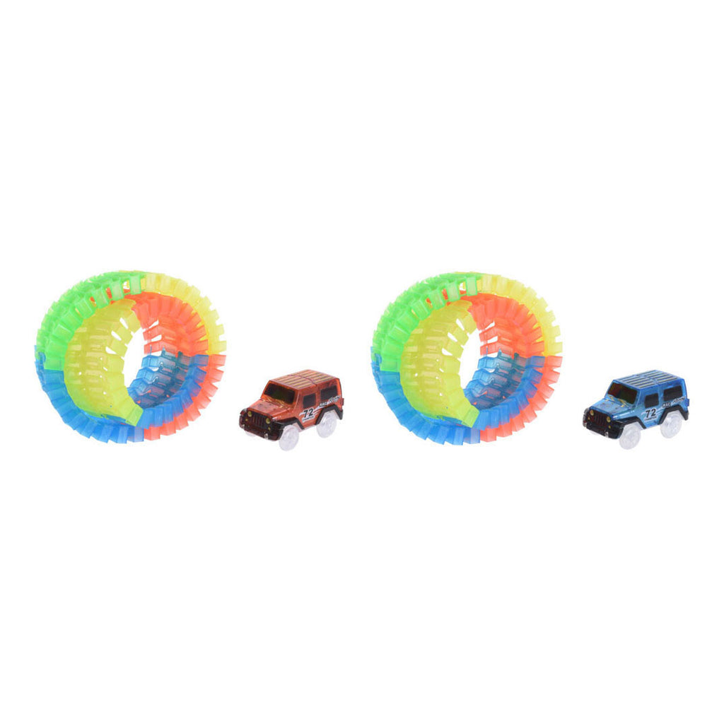 57-delige glow in the dark autobaan raceset, inclusief 1 speelgoedauto met licht. Niet geschikt voor kinderen jonger dan 3 jaar.
