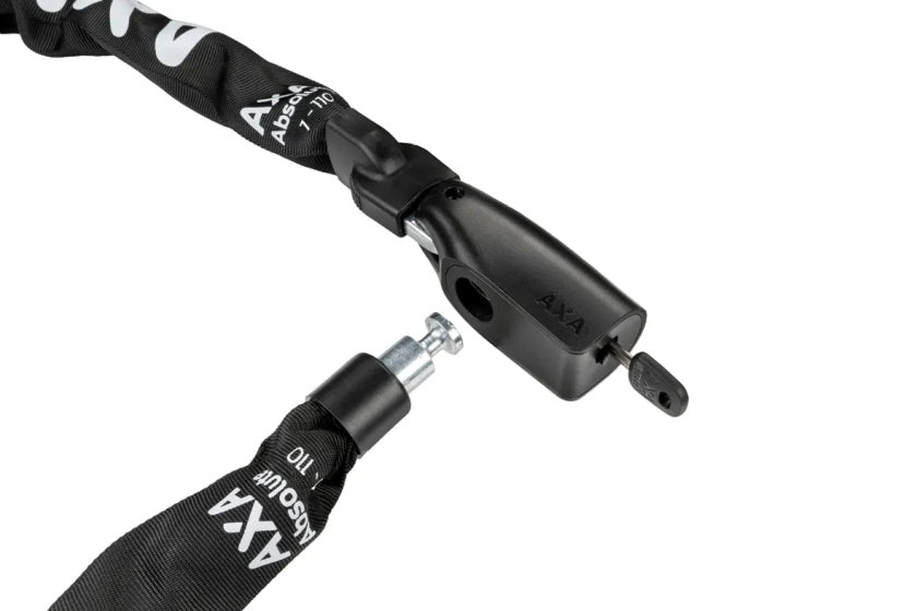 De Absolute 7 is een robuuste ketting, perfect voor het beveiligen van fietsen die voor een middelmatige periode worden achtergelaten op locaties met een matig diefstalrisico, zoals bij scholen of onbeheerde fietsenrekken. Met lengtes van 110 cm of 150 cm kun je je fiets gemakkelijk aan een paal of hek vastmaken. Deze ketting heeft een handige automatische klik-in functie, waarmee je het uiteinde in de slotkop kunt klikken zonder de sleutel te hoeven draaien. De 7 mm dikke gehard stalen schakels en de cilinder met beschermende afdekking zorgen ervoor dat de ketting bestand is tegen vocht en vuil, wat de levensduur verlengt. Bovendien voorkomt de stevige polyester hoes krassen op je fiets. Veiligheid: Veiligheidsniveau 9 Gehard stalen ketting Comfort Sterke polyester hoes om schade te voorkomen Geïntegreerde slothuis met automatische klik Online sleutelservice Roestvrijstalen details Technisch Lengte 110 cm Diameter schakels Ø 7 mm 2 symmetrische sleutels