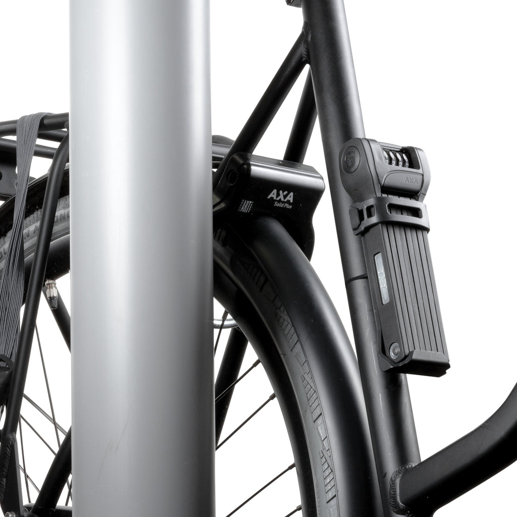 De Fold Lite C100 is een licht gewicht vouwslot voor dagelijks gebruik. Hij is ontwikkeld voor fietsen die voor een kortere tijd geparkeerd worden op een plek met een laag diefstal risico (bijvoorbeeld in een dorp of een bewaakte stalling). Het vouwslot wordt inclusief handige houder geleverd. De houder kan op de bidonnokken gemonteerd worden. Mocht dat niet aanwezig zijn op de fiets, kan de houder aan de stang vastgemaakt worden met de 2 mee geleverde strips. Dankzij het antirammelmechanisme heb je tijdens het fietsen geen rammelend geluid. De Fold Lite is 100 cm lang en heeft flexibele scharnierpunten, hierdoor kan je je fiets makkelijk aan een paal of hek vastmaken. De diameter van de gehard stalen schakels is 5 mm. Verder hebben de schakels een rubberen behuizing die ervoor zorgt dat er geen krassen op je fiets komen. Het slot sluit je af met een 4-cijferige code, die zelf in te stellen is. Ideaal voor als je geen sleutel bij je wilt hebben. Safety description: Veiligheidsniveau: 7 Comfort description: Zacht omhulsel om krassen te voorkomen Handige bracket Past op alle frames Geschikt voor: stadsfietsen, race fietsen, mountain bikes en kinderfietsen Technical description: Lengte: 100 cm Schakels: 20 x 5 mm De houder kan makkelijk gemonteerd worden op de bidon nokken De houder kan ook gemonteerd worden met 2 meegeleverde flexibele strips Gewicht: 725 gr Veiligheidsinformatie: Beveiligingsniveau: 7 Technische informatie: Diameter schakel: 5 mm Automatische click-in Nee Sleutelservice Nee Cilinder bescherming Nee Beschermd tegen boren Nee Kleur primair Zwart Slotlengte 100 cm Productlengte 185 mm Productbreedte 70 mm Producthoogte 35 mm Sluitmechanisme Code Logistieke informatie: Afmetingen verpakt product: 280 x 110 x 50 mm Productgewicht: 725 gr Verpakt product gewicht: 855 gr Montage informatie: Inclusief bevestigingsmiddelen: Ja Houder inclusief: Ja
