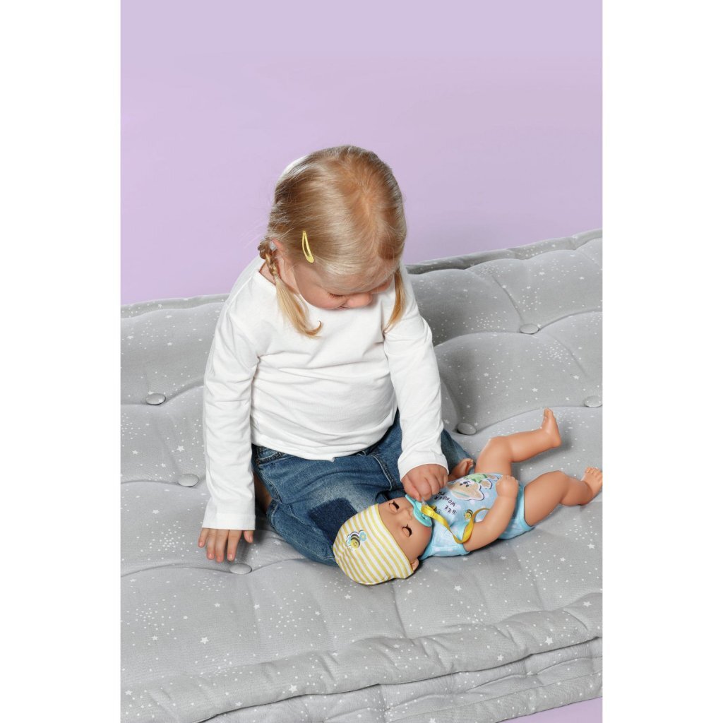 Baby Born Lukasheeft 7 geweldige functies, die allemaal zonder batterijen werken. Hij heeft alles bij zich wat hij nodig heeft. Hij kan water drinken uit zijn flesje, op het roze potje gaan en je kunt zijn luier verschonen. Als je het speentje dat aan zijn lichaam vastzit in zijn mond stopt, gaan zijn ogen op magische wijze open of dicht. Geef je hem het speentje en draai je het naar links, dan sluit hij zijn ogen. Als je het naar rechts draait, opent hij zijn ogen. Maar leg je hem in zijn bedje voor een dutje, dan vallen zijn ogen zelfs zonder speentje dicht. Zijn armen, benen en hoofd zijn heel flexibel waardoor aankleden en uitkleden kinderspel is. Met zijn 36 cm is hij geschikt voor kleinere kinderhanden vanaf de leeftijd van 1 jaar. Hij is de perfecte pop om voor de allereerste keer gevarieerd mee te spelen alsof het een baby is. Je kind kan zelfs samen met de pop op het potje gaan voor een speelse zindelijkheidstraining.