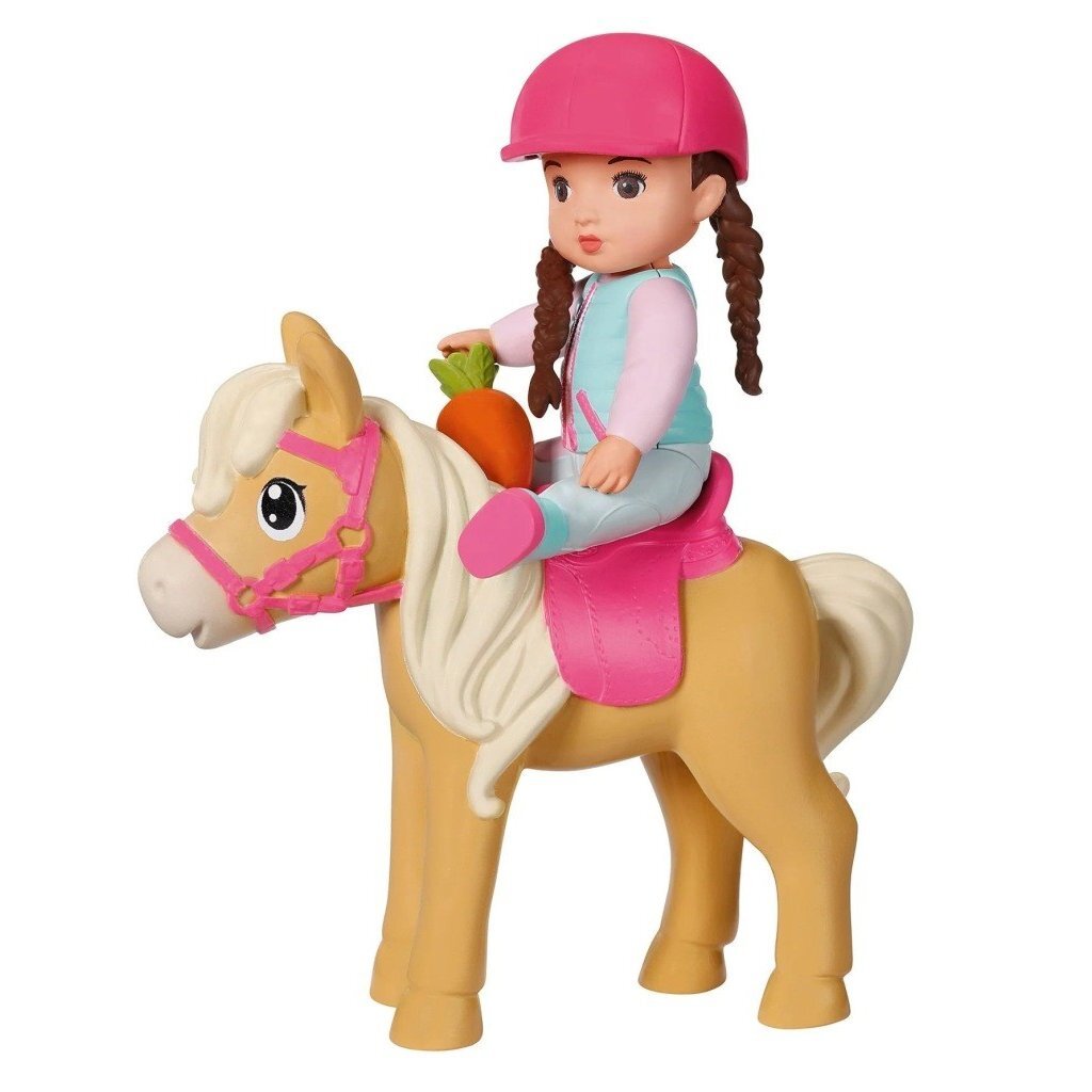 Baby Born mini speelset paardrijden met pop, wortel, helm en paard. Geschikt voor kinderen vanaf 3 jaar.