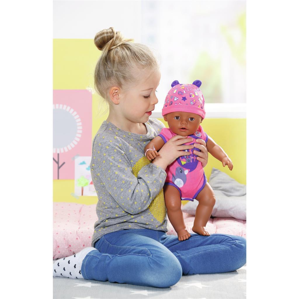BABY born® Soft Touch.Met negen levensechte functies voor nog meer plezier. Afwisselend (rollen) spel met BABY born® stimuleert de verbeelding en is een bewezen ondersteuning van sociale vaardigheden zoals verantwoordelijkheid, communicatie en empathie. Geen batterijen vereist. BABY born® Soft Touch Meisje met bruine ogen, met bodysuit en mutsje. Bevat 1 potje, 1 luier, 1 bord met lepel, 1 portie pap, 1 fles, 1 speentje met ketting, 1 geboortebewijs en 1 vriendschapsarmband elk voor het meisje en haar pop. Afmeting: 43 cm. Geschikt vanaf 3 jaar.