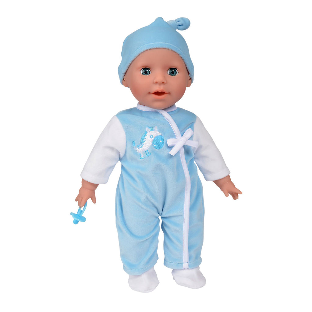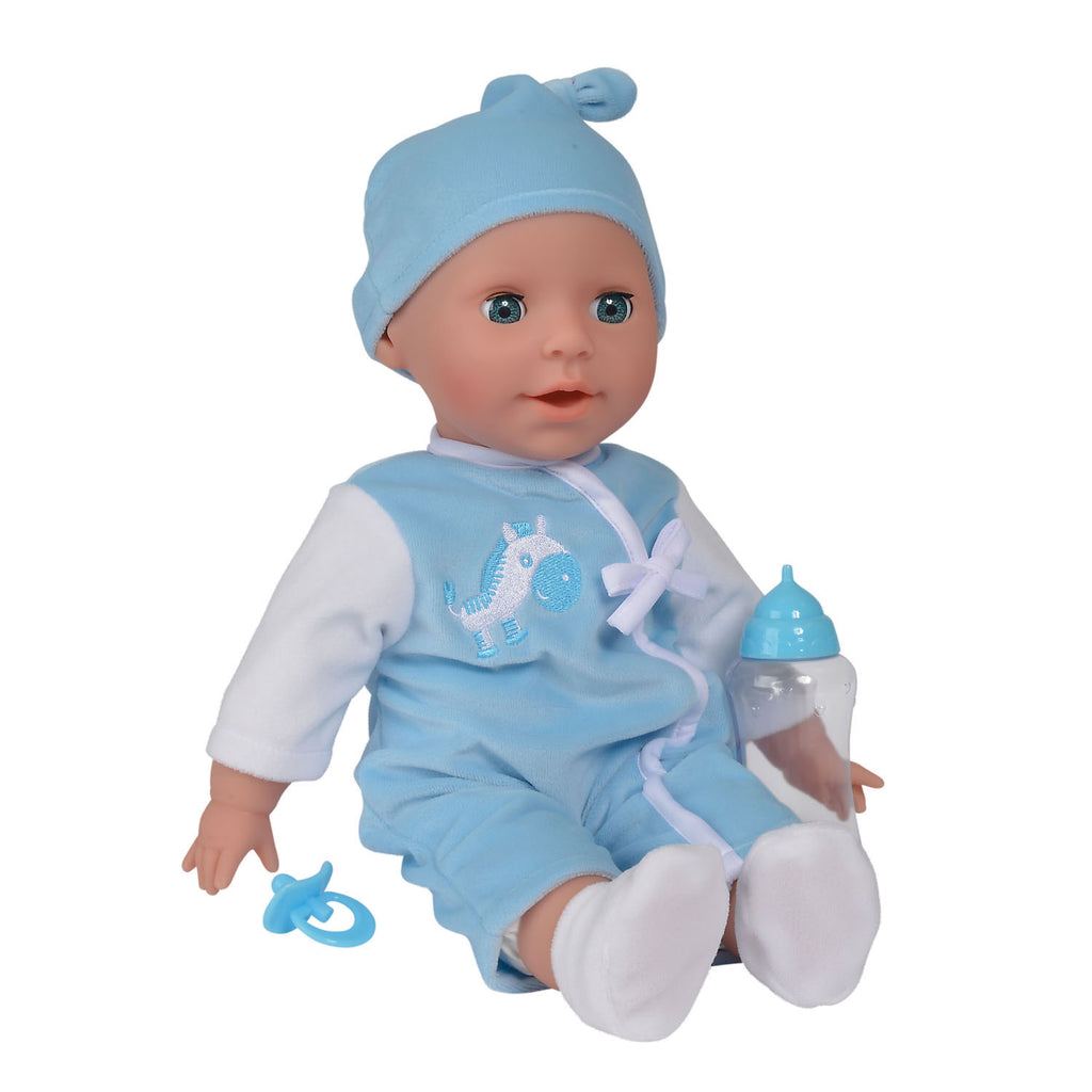 Moedertje spelen wordt nog leuker met deze pratende Baby Laura jongenspop. De pop is 38 cm groot en heeft stevige handjes, voeten en hoofdje en een zacht lijfje. De jongenspop draagt een mooi blauw/wit pakje en heeft beweegbare oogleden. Druk zachtjes op zijn buikje en hij maakt geluidjes. Met 24 geluiden is het spelen met de pop elke keer verrassend! Inclusief batterijen, melkflesje en speentje.