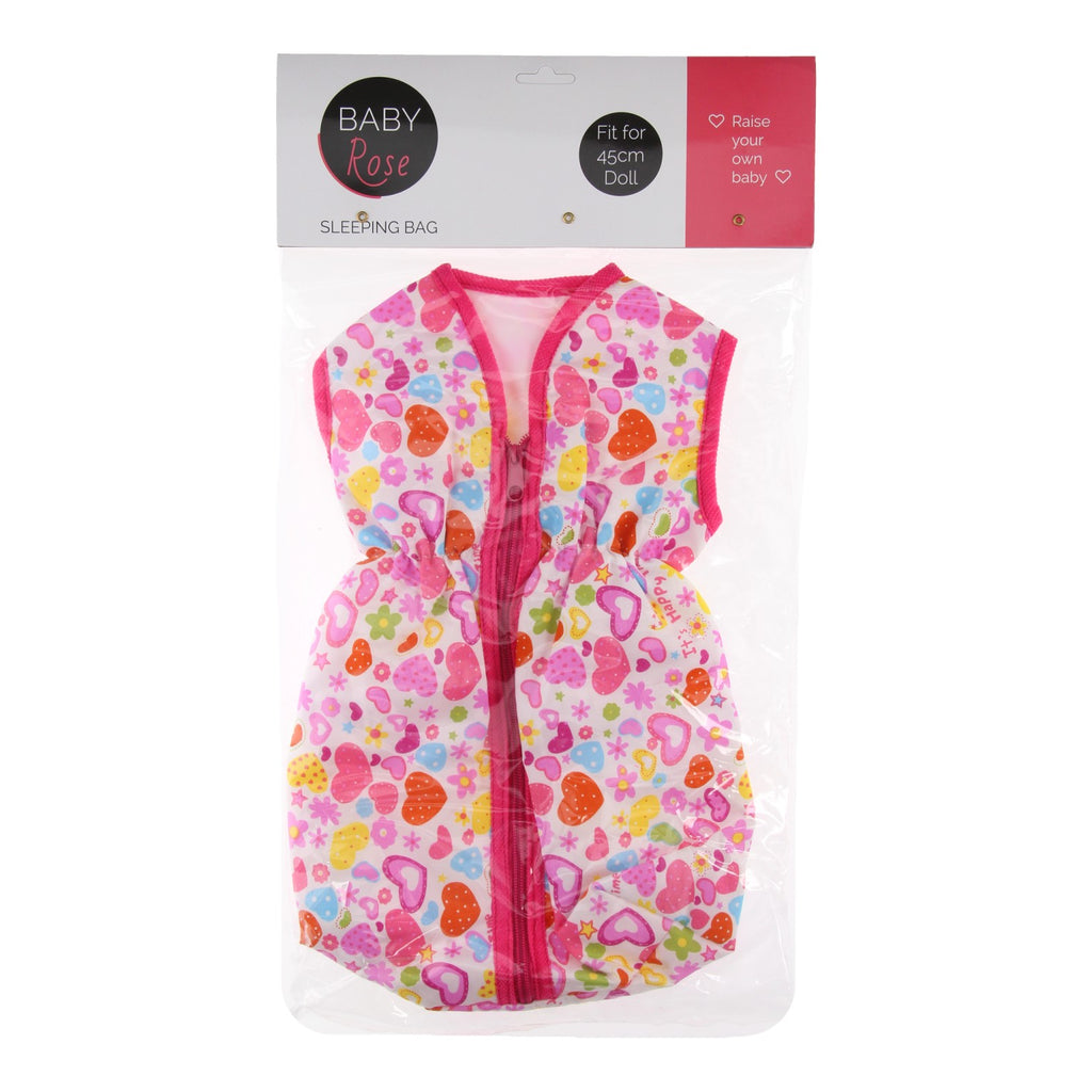 Wat zal je pop lekker slapen in deze slaapzak van Baby Rose. De slaapzak is voorzien van een roze rits en heeft een kleurrijk patroon van hartjes en bloemen. De slaapzak is geschikt voor poppen met een lengte tot en met 45 cm en is brandvertragend.