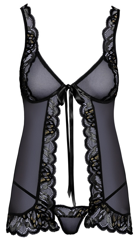 Babydoll en string set van kissable. Babydoll gemaakt van fijn powernet gemengd met elegant effect kant. Zacht en elastisch rondom voor het hoogste draagcomfort. De korte babydoll is open aan de voorkant en sluit alleen met een clipsluiting onder de decoratieve satijnen strik. Cup beugels en verstelbare bandjes zorgen voor een perfecte pasvorm. Het geraffineerde stringetje van effectkant verleidt met zijn twee smalle elastische bandjes die bij het kruis samenkomen.