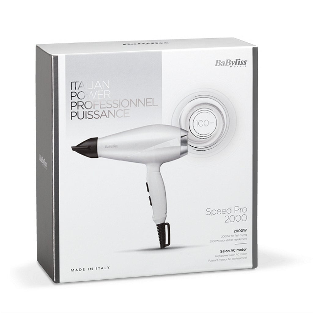 Gemaakt in Italië, een salonwaardige 2000 W föhn met een AC-motor voor een snel en professioneel resultaat. Deze Speed Pro 2000 Föhn 6704 WE van Babyliss heeft een professionele AC-motor. Dit is een krachtige motor die tot wel 100 km/uur lucht blaast en langer meegaat dan föhns met een DC-motor. Daarom krijg je ook 5 jaar garantie van Babyliss. Bij de föhn krijg je een smalle blaasmond van 6 mm. Doordat hij zo smal is kan er geconcentreerd lucht uit de blaasmond komen en krijg jij je haar mooi strak gestyled. Je kunt hierdoor wat preciezer met iedere lok aan de slag.
