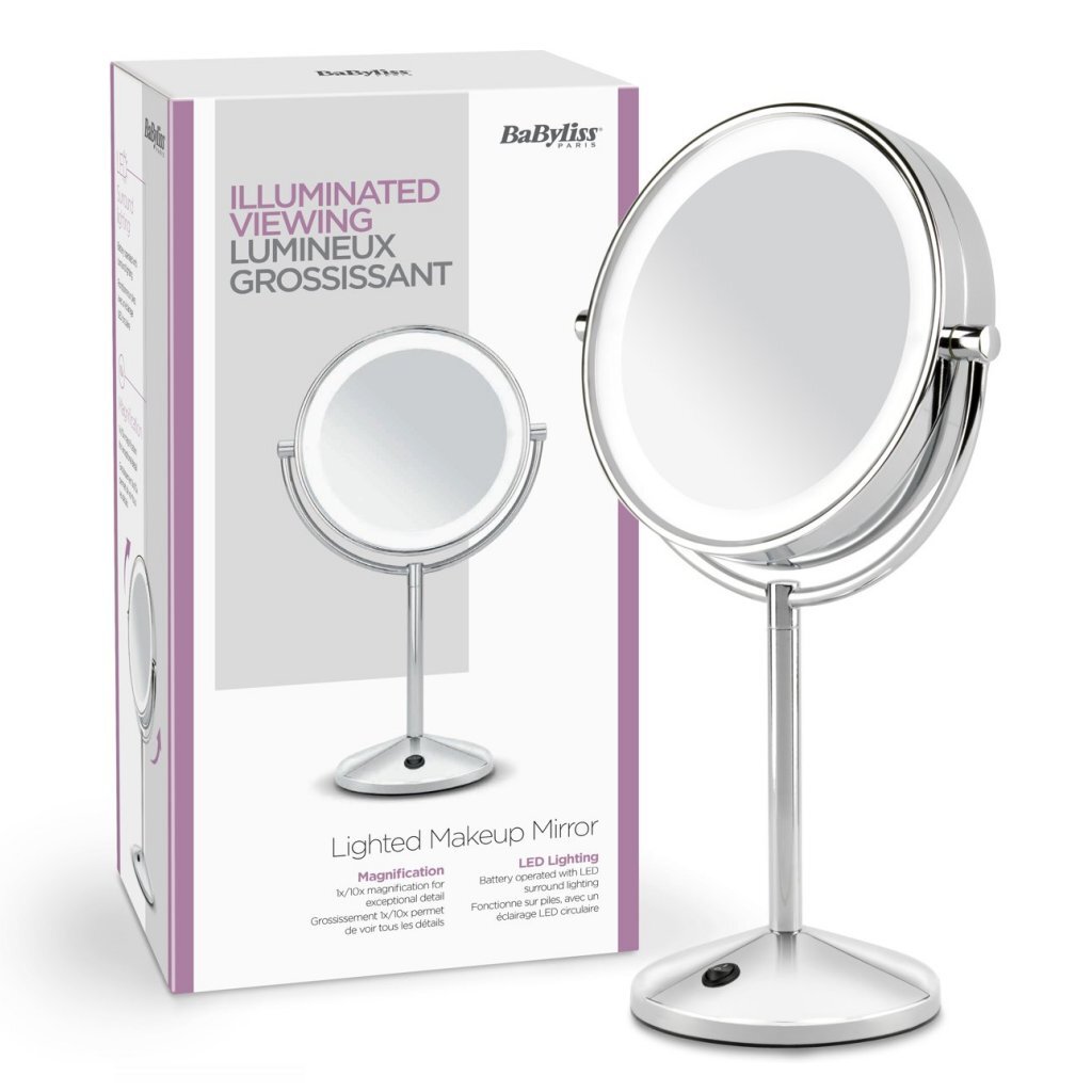 De Babyliss 9436E LED make-up spiegel is een tijdloze make-up spiegel met LED-lamp met een verlichting rondom. De spiegel is dubbelzijdig, met aan de ene kant 1 x en aan de andere kant 10 x vergrotend zicht. De spiegel werkt op batterijen, zodat je alle vrijheid hebt in het plaatsen van de spiegel in je huis.
