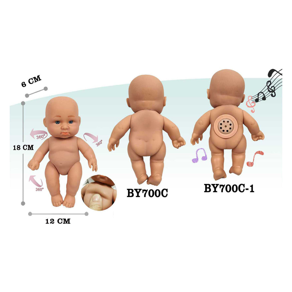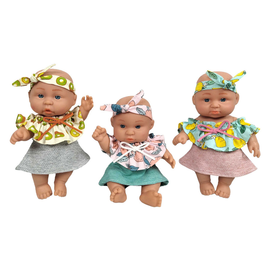 Babypopje van 18 centimeter groot, gemaakt van zacht kunststof. De pop heeft volledig draaibare armen en benen en maakt geluid als je op haar buikje drukt. Ze draagt een vrolijke outfit met fruitpatroon (citroen, kiwi of mandarijn). Geschikt voor kinderen van 3 jaar en ouder.