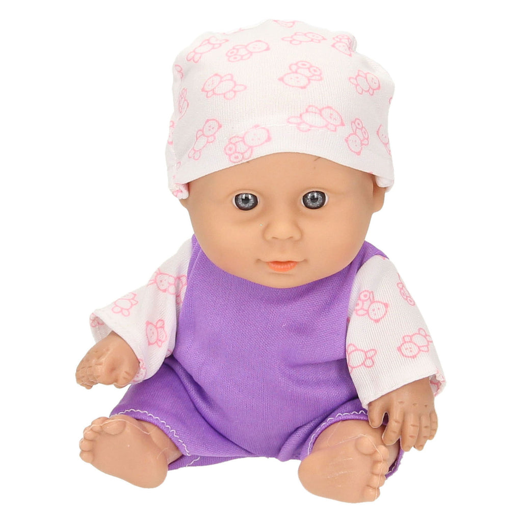 Schattig klein babypopje met stevige ledematen die in zithouding geplaatst kunnen worden. Het popje is gemaakt van kunststof en heeft een snoezig pyjamaatje aan en een mutsje op. De pop heeft een lengte van 18 centimeter. Verkrijgbaar in 6 verschillende kleuren/prints en geschikt voor kinderen vanaf 3 jaar oud.