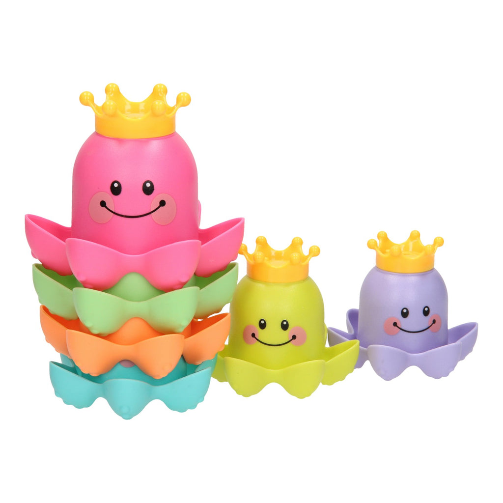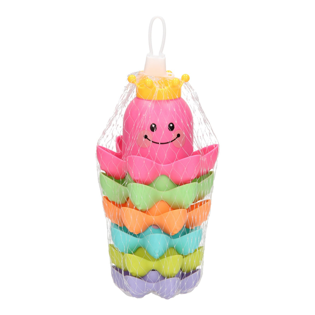 Met dit vrolijke badspeelgoed kun je de kleine wel even vermaken! De kunststof stapelbekers hebben de vorm van een octopus zijn bedrukt met een vrolijk gezichtje. Stapel de gekleurde bekers op elkaar of vul de bekertjes met water. Dankzij de gaatjes in het kroontje kunnen de bekers ook als gieter gebruikt worden.